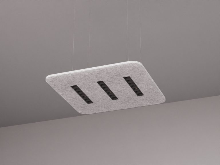 Panel fonoabsorbente fabricado en PET reciclado. Material ignífugo (certificación al fuego: B, s2, d0). Cumple CTE DB-SI para locales de pública concurrencia.